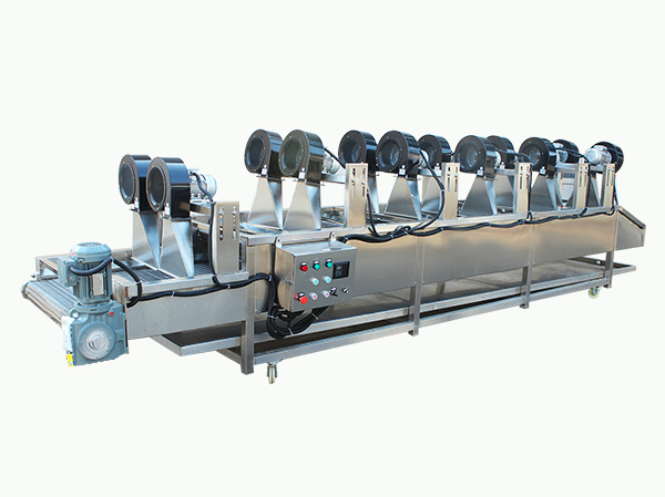 物料通過網(wǎng)帶傳輸進(jìn)入,經(jīng)多次翻轉(zhuǎn),以實(shí)現(xiàn)物料的多面受風(fēng)及受風(fēng)的均勻性,通過離心風(fēng)機(jī)的高壓風(fēng)力將食品冷卻或?qū)⒈砻嫠执蹈?,風(fēng)嘴成風(fēng)刀狀,有效地提高了風(fēng)量壓力,使物料表面的水分在短時(shí)間內(nèi)吹走或蒸發(fā),便于儲(chǔ)藏或深加工。