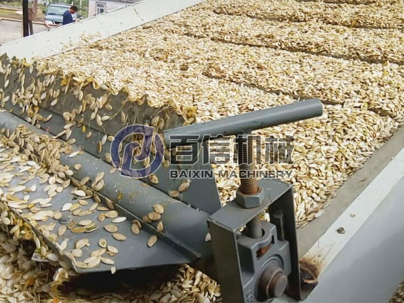 將需要干燥白瓜子等物料放置在輸送帶上,經(jīng)均料器后物料被平鋪在網(wǎng)帶上,輸送至烘干機內(nèi)部,在烘干機箱體內(nèi)呈“s"型逐層翻轉(zhuǎn)、下落,烘干后的白瓜子從出料口流出。經(jīng)過轉(zhuǎn)換后的熱風從烘干機底部進入,由于下部壓力大于上部壓力,熱氣流自下而上穿過每一層網(wǎng)帶和其上的物料層,逐層烘干,熱量交換均勻、充分,生產(chǎn)效率高,干品品質(zhì)好。