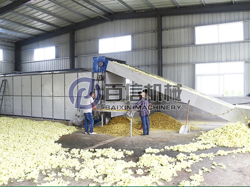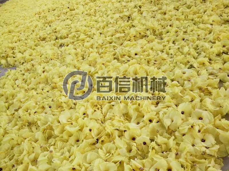 黃蜀葵花藥材的主要有效成分是總黃酮,其含量在5%-6%。由于該花朵極易變色,變色后有效成分明顯下降,總黃酮含量?jī)H存1%左右,所以干燥必須及時(shí)。為了滿足大批量連續(xù)式干燥采用百信網(wǎng)帶式烘干機(jī)進(jìn)行烘干。黃蜀葵花烘干時(shí)去除花托,鋪料厚度3-5cm左右。烘干溫度是關(guān)鍵,應(yīng)控制在60-80℃。溫度過(guò)高則藥材容易烘焦。