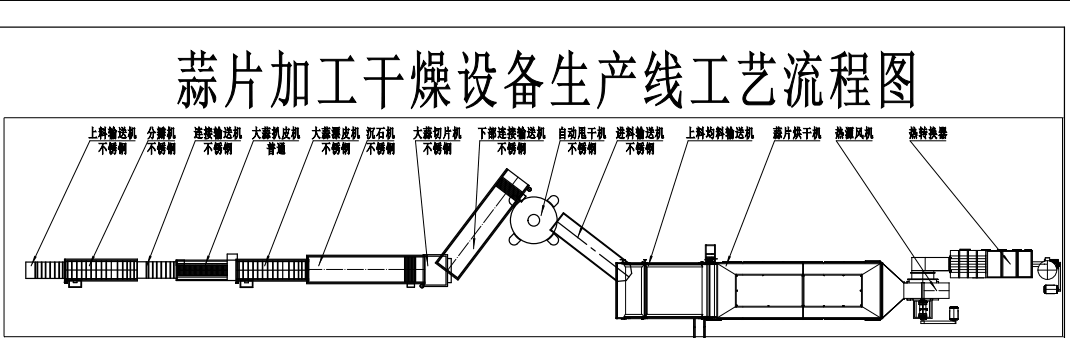 大蒜加工工藝流程:挑選-大蒜分瓣-蒜瓣扒皮-蒜瓣漂皮-沉石-大蒜切片-清洗-甩水-烘干-冷卻包裝