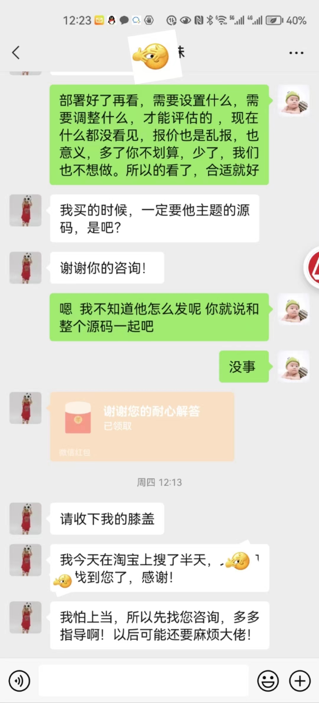 客戶最開始是在淘寶找的開發(fā),付款金額99元,項目做完后,PC端可以正常訪問,但是移動端沒有適配,后面就聯(lián)系不上開發(fā)人員了,后面又在QQ群里找了一個技術(shù),項目基本是做完了,但是還有遺留問題沒有處理。找到我們是咨詢相關(guān)怎么怎么處理,咨詢了三次,客戶也發(fā)了三次紅包。