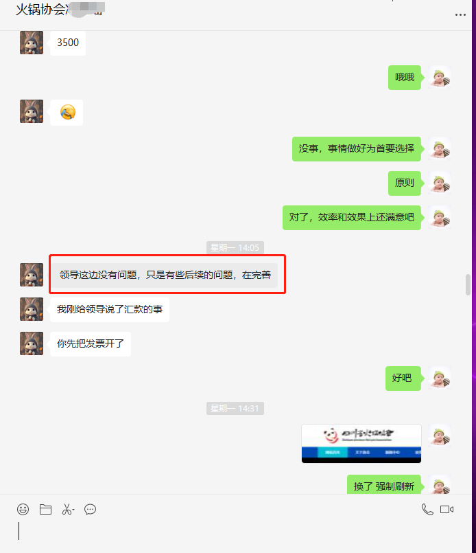 星期一協會領導也看過了,驗收完美通過,其實按照約定,簽訂合同當天就需要支付定金50%,到現在為止,項目都已經全部完成并且驗收通過,都還未支付款項的。當天開完發票后,第二天也成功收到全款。