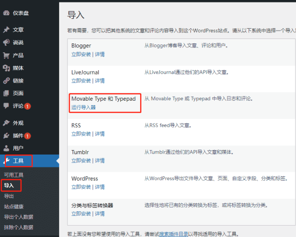 三、進入WordPress后臺,進入Movable Type 和 Typepad導入器,上傳剛剛從Zblog導出的TXT文件,就完成數據轉換了。