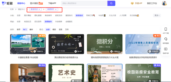 1、選模板: 直接進入網站,點擊【開始做視頻】或者直接進入【模板中心】,便可在線制作各場景的創意視頻了,快去選擇你喜歡的微課視頻模板進行編輯吧;