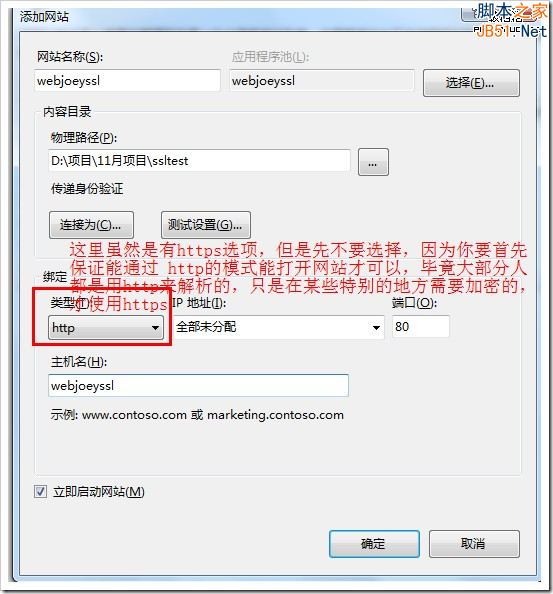 在添加的時候,綁定類型,先選擇 http 的類型,雖然這里有 https,但是還是首先要保證能通過 http能訪問網站,畢竟大部分的人都是通過http來打開站點的,只是在某些特別需要加密的地方用到https,我們下一步會綁定 https的,這里先不急,除非你整個站點都是https運用,那么這里才只選擇https。