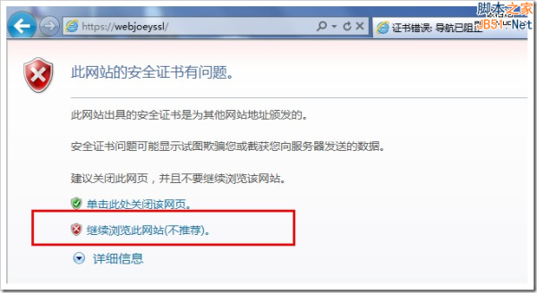 我們打開 http://webjoeyssl/ 或者是 https://webjoeyssl/ 會提示不安全,點擊繼續瀏覽即可。在實際的環境中,你拿到的是一個實際的證書,所以不會產生類似的報告安全證書有問題、