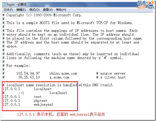 打開 hosts 文件,用于創建一個站點的名稱(例如 http://webjoeyssl 那么這個 webjoeyssl 就是我們需要創建的站點名稱,我用hosts解析為本地)