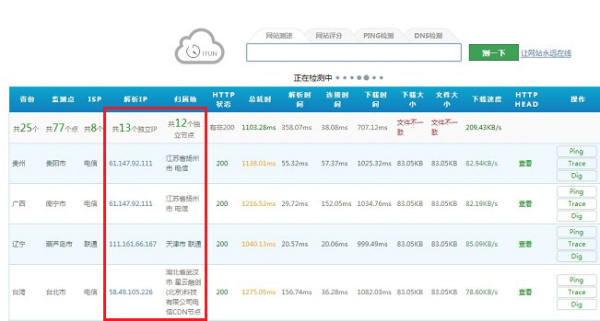 如果測(cè)試一個(gè)網(wǎng)址不同地區(qū)是不同的解析IP,那么說(shuō)明這個(gè)網(wǎng)站開(kāi)啟了CDN加速,并且可以看到不同地區(qū)打開(kāi)所花費(fèi)的時(shí)間,這里也可以看出速度。