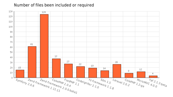 6. 文件數量 打開hellow word用到included or required in 文件的數量.越小越好,zend很多,yii19個,yaf才4個,不快才怪。