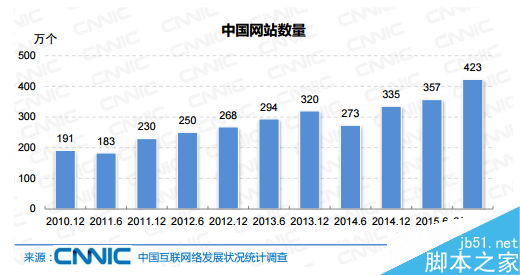 據中國互聯網絡信息中心(CNNIC)1月22日發布的第37次《中國互聯網絡發展狀況統計報告》中數據顯示,截至2015年12月,中國網站總數為423萬個,年增長 26.3%,其中“.CN”下網站數為213萬個。