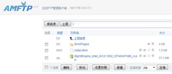 AMFTP基于web在線FTP文件管理客戶端,支持多文件、大文件極速上傳、支持zip、tar、gzip(tar.gz) 在線解壓與壓縮,支持新建文件、文件編輯、移動、重命名、權限設置等,安裝完成可在FTP版塊點對應賬號管理登錄。可以省去本地的FTP客戶端,如果你的文件較大,為了穩定性起見還是建議使用FTP工具。