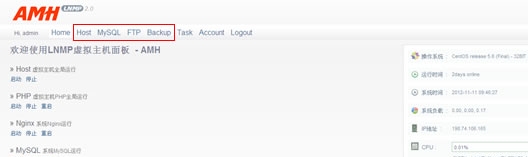 后臺比較清晰,看到頂部的 Host為添加站點管理站點的,MYSQL為添加和管理數據庫,FTP為添加和管理FTP賬戶的,BACKUP為備份數據的。看下添加站點是否復雜。