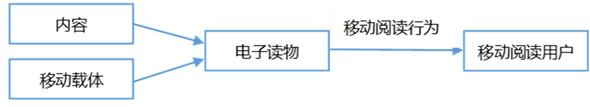 從移動閱讀組成要素來講,主要有三個:移動閱讀用戶(主體)、電子讀物(由內容和移動載體組成的客體)、行為(用戶的態度與行為表達),如下圖所示。