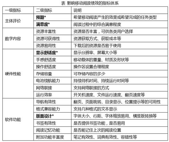 1.2 影響移動閱讀績效的指標 有關影響移動閱讀績效指標的研究很多,相關指標主要可以分為四類:主體評價、數字內容、硬件性能、軟件功能(詳見下表)。