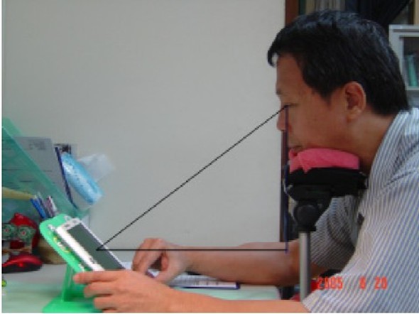 B.文字最小可接受的視角 通常由字號大小與閱讀視距決定,實驗室測量方法如下圖所示。在電子書閱讀測試中,針對接近正方形的中文字(即,字高等于字寬),一般可接受最小視距為30cm以上,適當視距為50cm。青年組(20-35歲)“字高”至少為4.8mm(24pt),中年組(36-50歲)至少為5.14mm(25pt)。當固定近似正方形中文字體的字高4.85 mm與行距3 mm,字元間距為0.61 mm 或1.21 mm會有較好的績效,而且也不會增加視覺疲勞[2]。