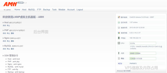 簡單看一下后臺界面,還是比較清爽的。不過導航是英文的,估計有些朋友有點頭大,其實也一樣的,一點都不復雜。右側我們可以看到我256M的內存VPS占用了88M。還算不錯。