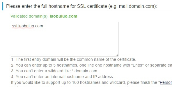 我們可以最多填寫包含"laobuluo.com"5個子域名,一行一個,StartSSL免費SSL只能支持5個,如果需要多個,那就需要購買付費服務。