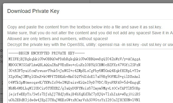 按照StartSSL的文檔一步步的來。不過我是直接選擇在 https://startssl.com/Certificates 中設置「Certificate Signing Request (CSR)」>「Generated by PKI system」,又因為在線生成證書這一步必須得輸入密碼,所以導致下面的問題(上傳自己在服務器上生成的證書可能不會碰到這個問題):