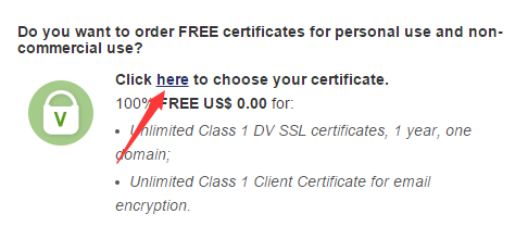 在后臺面板中我們可以看到很多付費的SSL證書,具體的有什么特別之處我也不去了解了,這里找到上圖所示的位置,看到是免費證書就是我們要找的,點擊HERE鏈接進入下一步看看需要點什么資料才可以申請到。