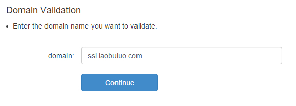 這里小編僅僅是為了測試StartSSL免費SSL證書的申請過程,也沒有準備用到實際的網站中,所以暫且用laobuluo.com其中一個二級域名作為申請證書測試。