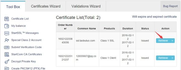我們可以看到StartSSL證書后臺還是比較清晰的,一般的工具我們不需要用到,如果后面小編在實際用途的時候需要用到在補充。這里我們需要做的就是將證書下載下來。默認是免費1年,到期之前是可以續約的,也是免費的。