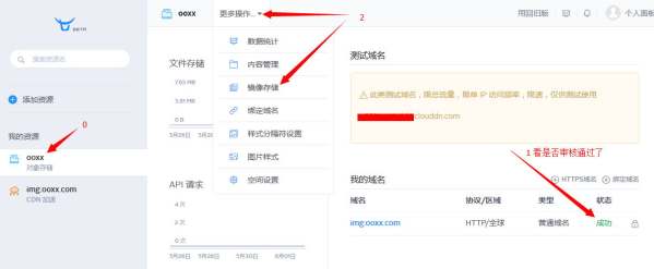 6.如下圖:0 點擊建立的對象存儲,1 看看是否通過審核了,2 如果菜單隱藏了,點擊“更多操作”,然后點擊“鏡像存儲”