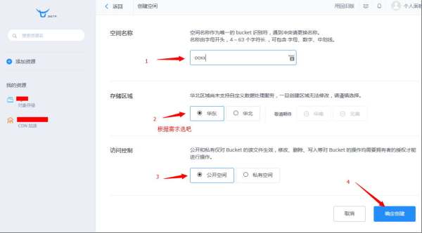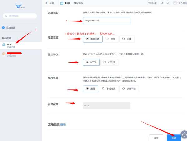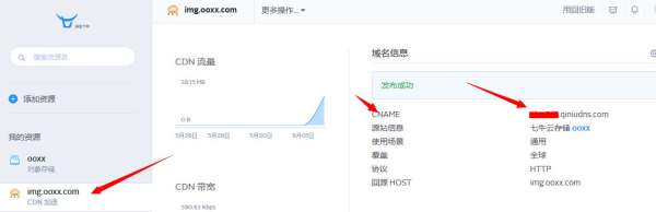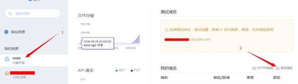 4.創建好后,就會在側邊欄“我的資源”顯示出來,如樣例中的是 ooxx(對象存儲),點擊它,然后參照下圖綁定域名(提示:不綁定也可以,可以用七牛提供的3級域名)
