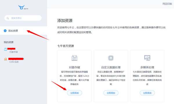 2.注冊好+登錄后,如下圖所示:點擊“添加資源 > 對象存儲”