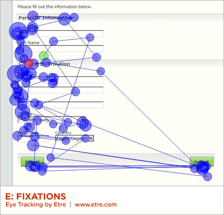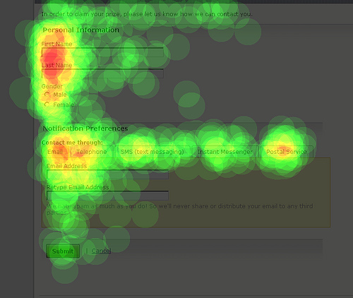 從這張熱點圖中可以看出,對于表單類別的視覺走向是以左邊標簽為主向右延展。大部分用戶集中在標簽位置,通常用戶填寫順序也是從上至下的,從左至右,較少用戶會選擇跳躍式的填寫模式。