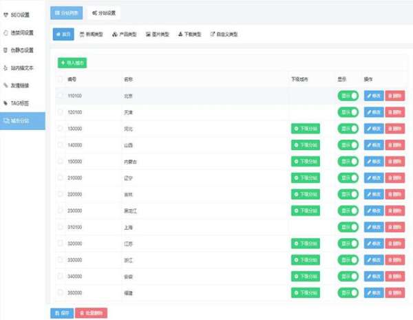 3、新增城市分站功能,可指定欄目、指定頁面生成分站頁面、支持詳情頁分站頁面、分站列表前臺顯示、自定義內(nèi)容編輯、城市篩選、可對城市列表詳情ID、SEO標(biāo)題、描述、關(guān)鍵詞的自定義設(shè)置。真正快速解決傳統(tǒng)網(wǎng)站收錄低、收錄慢的問題,讓你的網(wǎng)站排名成為行業(yè)焦點。