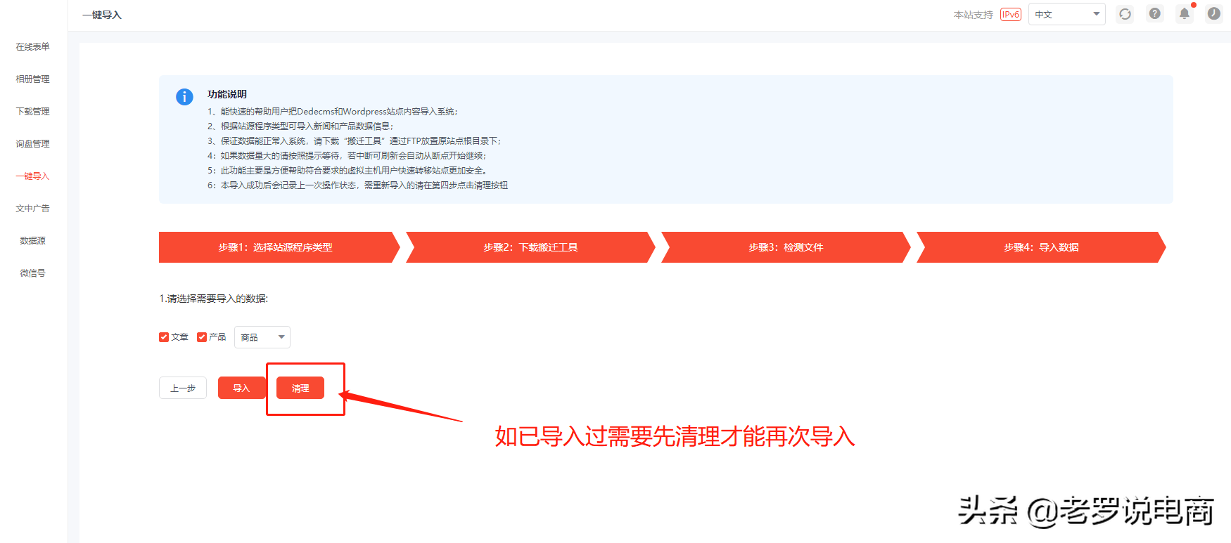 1.6 如果之前已導入過,需要點清理才能再次導入,初次使用不需要操作