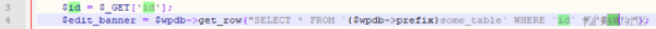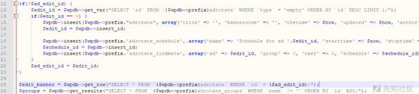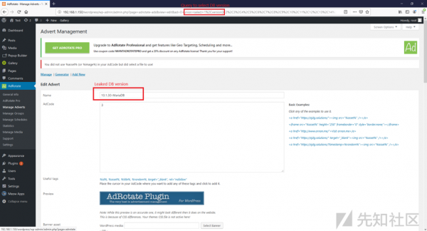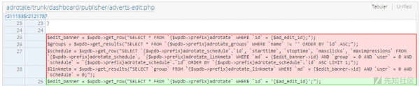 在前端進行輸入的時候,可以插入惡意的sql注入代碼,如果后端沒有對前端輸入進來的參數值進行安全過濾攔截,那么就會導致sql注入漏洞的發生,我們來看上面的一段代碼。該代碼在寫的時候,會將get中的ID,傳入后數據庫中進行查詢,沒有做任何的安全過濾導致sql注入,在wordpress最新版中以及將get、post、cookies、提交的方式進行了安全攔截,對一些非法的字符與sql注入攻擊語句加強過濾,但是還是被繞過,導致sql注入的發生,就拿adrotate插件來說,在dashboard目錄下的publisher文件夾下的adverts-edit.php代碼中第46行: