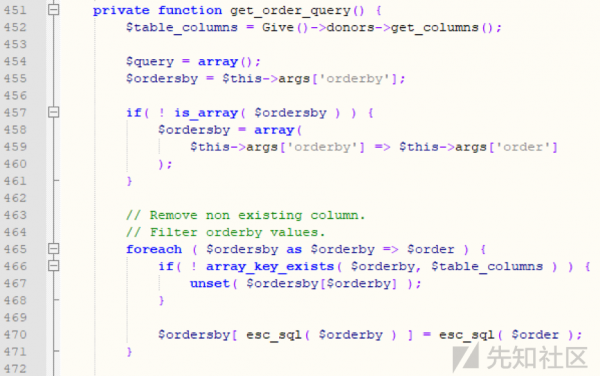 give插件,也存在漏洞,漏洞產生的原因是includes目錄下的donors文件夾里的class-give-donors-query.php代碼,在獲取訂單的函數中,沒有對其order by字符進行攔截,導致sql代碼可以到后端進行查詢數據庫,導致sql盲注。代碼如下: