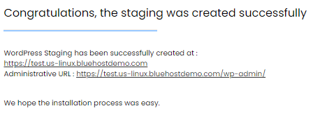 F)單擊“Create staging”。根據實時網站的大小,可能需要幾分鐘的時間。準備好后,您將看到如下圖所示的消息。您也可以在臨時網站上使用與實時網站相同的憑據。