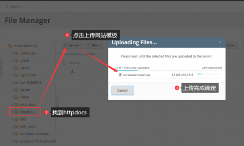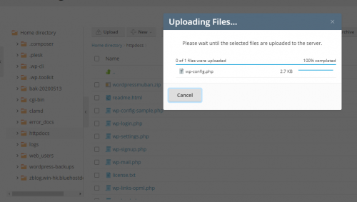 如果在第四步的時候,沒有給到目錄訪問權限,那么在建站的過程中到安裝這一步會出現讓你手動創建一個wp-config.php文件,直接復制提示內容上傳即可。如下圖上傳wp-confing.php文件