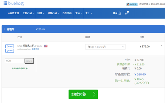 選擇Windows系統的虛擬主機,由于只是建個博客站,我選擇的就是PlanA方案,優惠碼MDD有7折優惠;聯系他們的客服能獲得一個免費的域名。