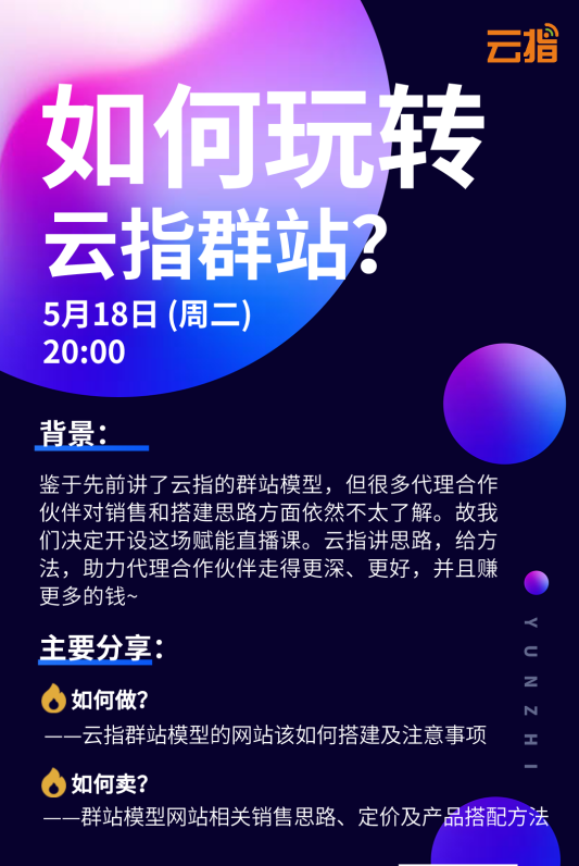 鑒于先前講了云指的群站模型,但很多代理合作伙伴對銷售和搭建思路方面依然不太了解。故我們決定開設這場賦能直播課。云指講思路,給方法,助力代理合作伙伴走得更深、更好,并且賺更多的錢~