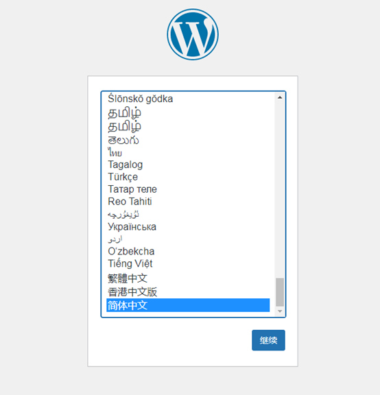 通過(guò)域名/wp-admin/install.php(直接訪問(wèn)IP),出現(xiàn)網(wǎng)站后臺(tái)登錄選擇語(yǔ)言框;