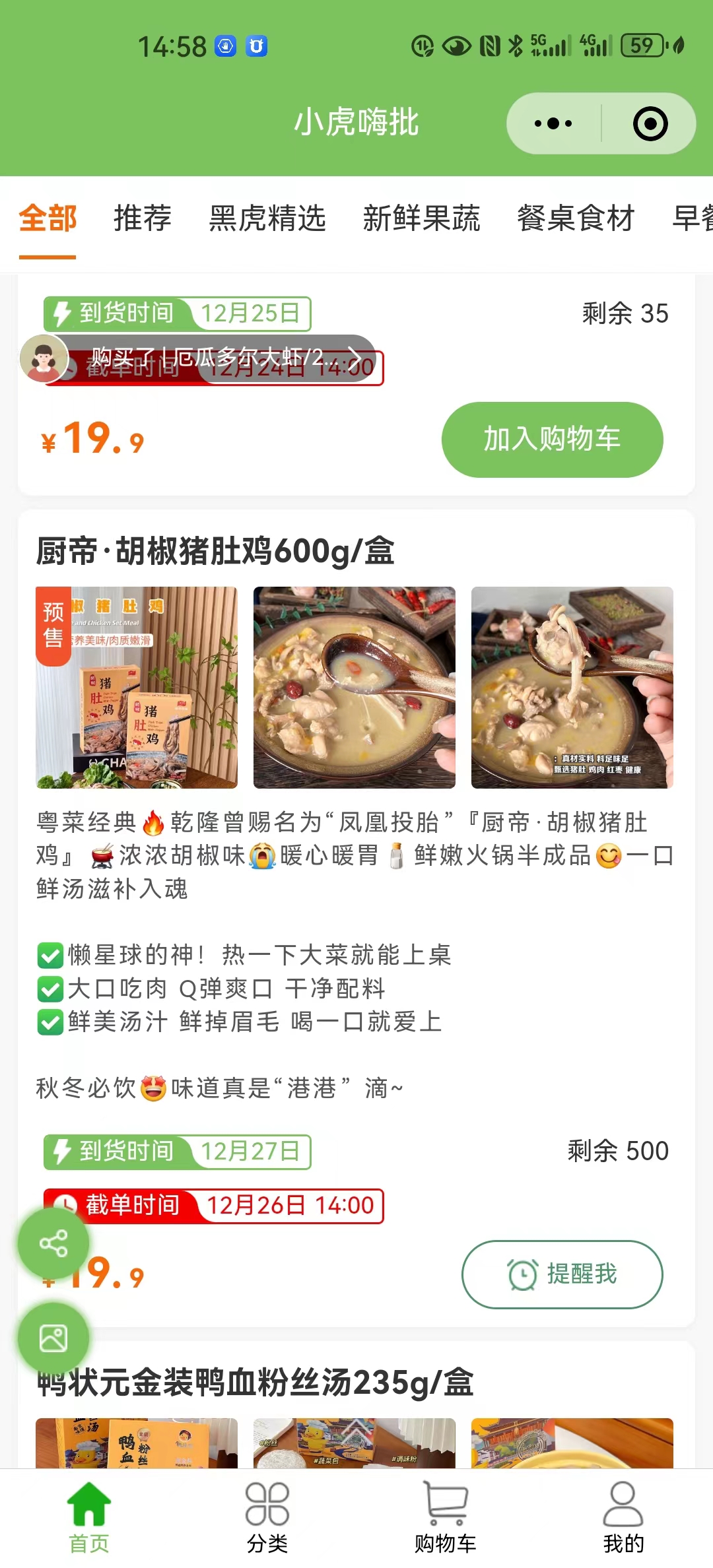 主要功能:商品優選、限時秒殺、支付、訂單、購買、預計到貨時間、商品分提貨碼、團長申請、供應商管理等。
