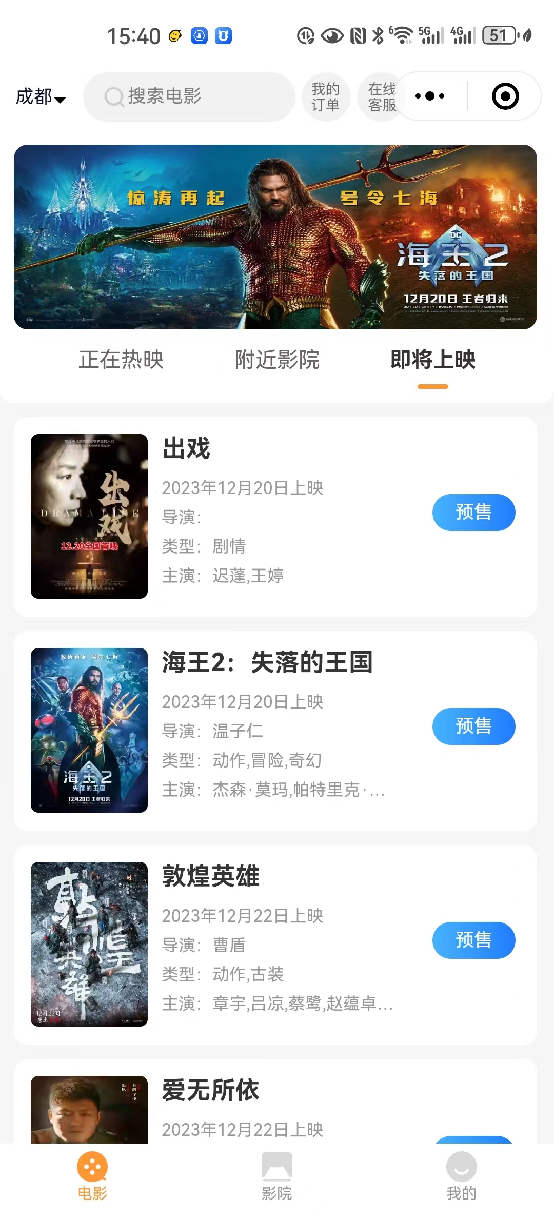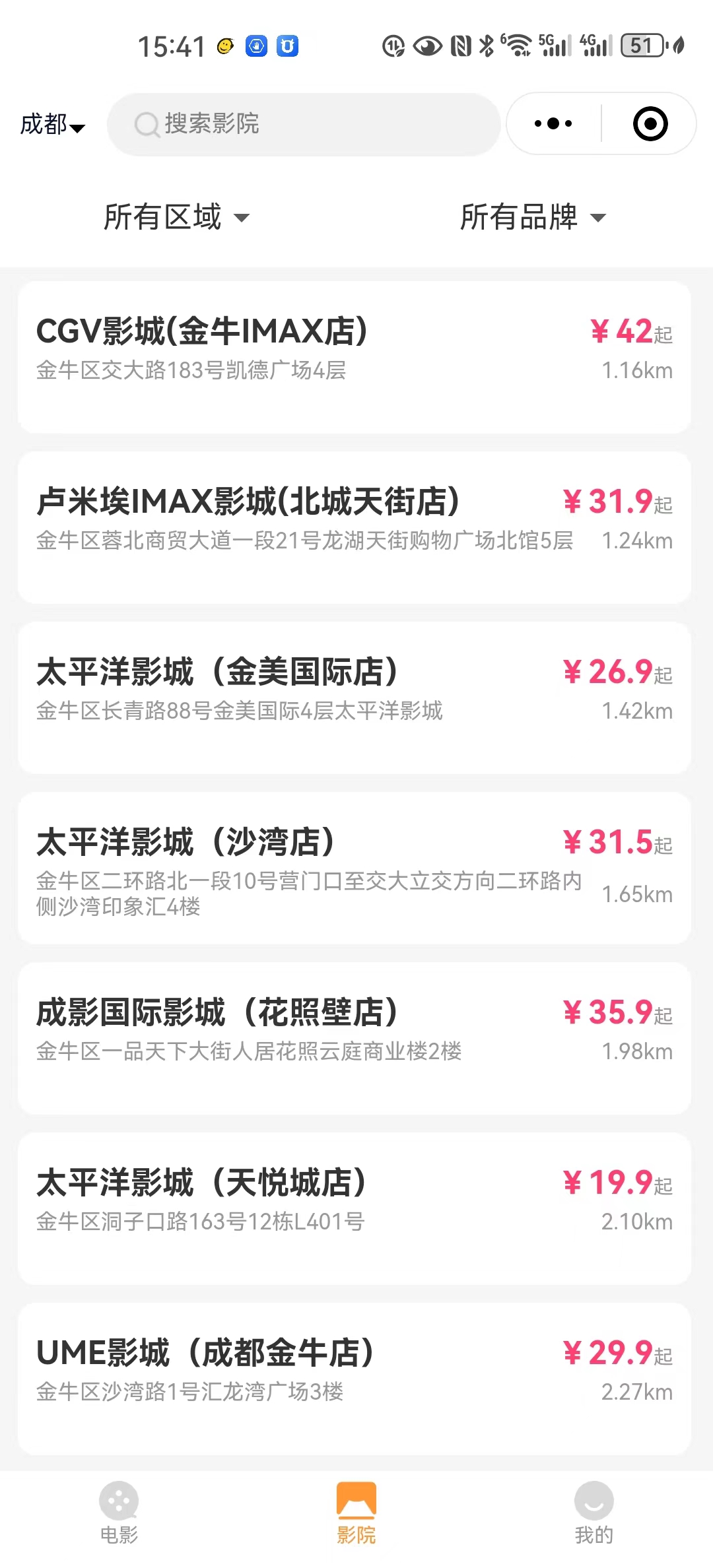 自動定位所在地,推薦附近的影院進行購票。可以選位,查看可選、已售、情侶座等。包括正在熱映和即將上映的也會有顯示。