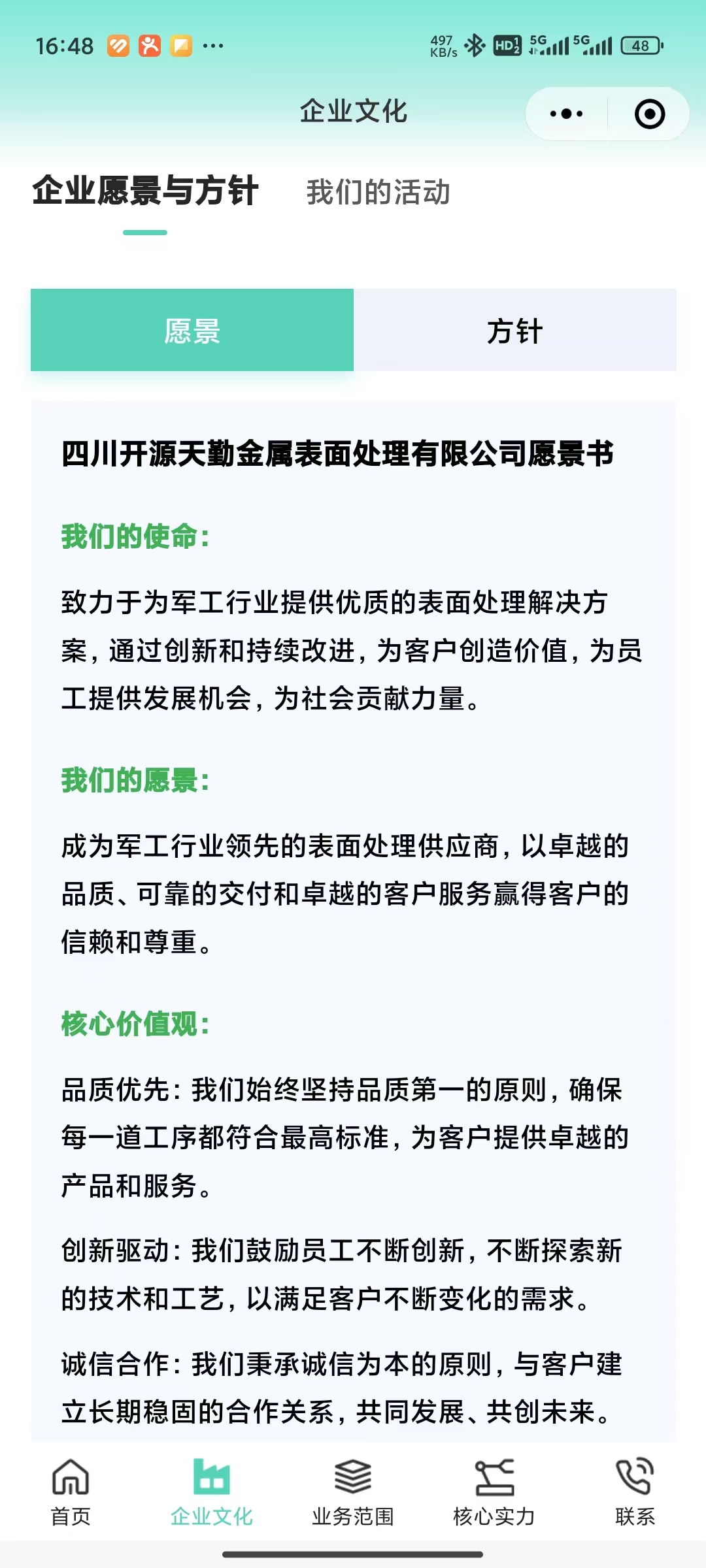 致力于為軍工行業提供優質的表面處理解決方案,通過創新和持續改進,為客戶創造價值,為員工提供發展機會,為社會貢獻力量。