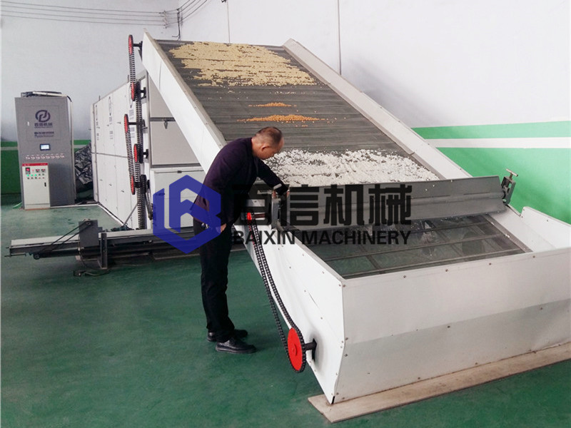 整個設備中的熱風通斷與風量大小、網(wǎng)帶運行快慢、烘室內溫度高低與濕度大小等狀態(tài)都可以通過電控系統(tǒng)進行調節(jié),以免過烘,降低爆腰率。