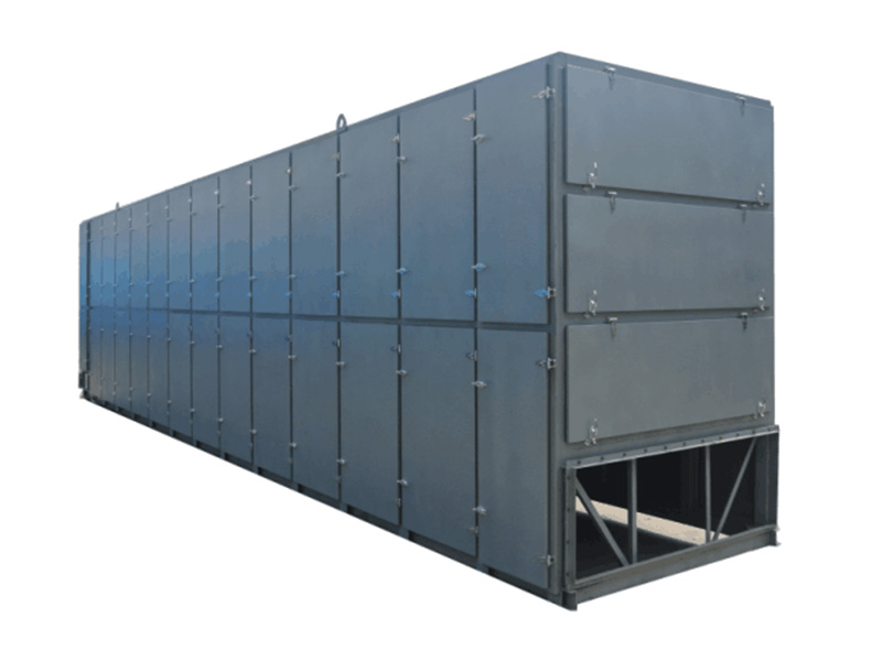 將物料放置到輸送帶上,經(jīng)輸送帶上的均料裝置后,平鋪到烘干機(jī)網(wǎng)帶上,物料在烘干機(jī)內(nèi)由一層逐一過渡到下一層,每層之間設(shè)置有導(dǎo)料和反轉(zhuǎn)裝置,使物料充分與載熱體接觸;物料從 后一層流出。載熱體由風(fēng)機(jī)引入到烘干機(jī)內(nèi)部,引風(fēng)機(jī)產(chǎn)生的風(fēng)速、風(fēng)壓使載熱體充分、均勻的散布在烘干機(jī)底部,由于下部壓力大于上面壓力,載熱體向上運(yùn)動(dòng),穿過每層網(wǎng)帶,使物料與載熱體充分接觸,提高烘干效率。