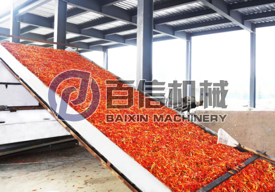 將需要干燥的辣椒放置在輸送帶上,經(jīng)均料器后物料被平鋪在網(wǎng)帶上,輸送至網(wǎng)帶式辣椒烘干機內(nèi)部,在烘干機箱體內(nèi)呈“s"型逐層翻轉(zhuǎn)、下落,烘干后的辣椒 從出料口流出。經(jīng)過轉(zhuǎn)換后的熱風從烘干機底部進入,由于下部壓力大于上部壓力,熱氣流自下而上穿過每一層網(wǎng)帶和其上的物 料層,逐層烘干,熱量交換均勻、充分,生產(chǎn)效率高,干品品質(zhì)好。