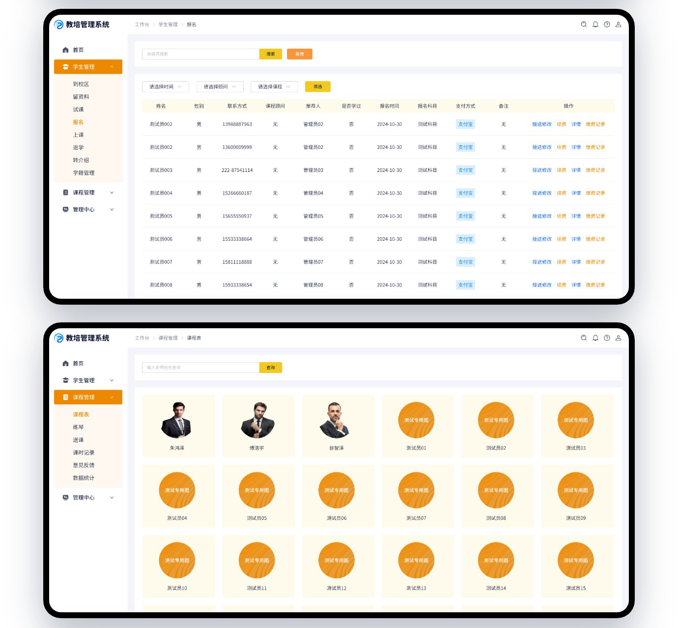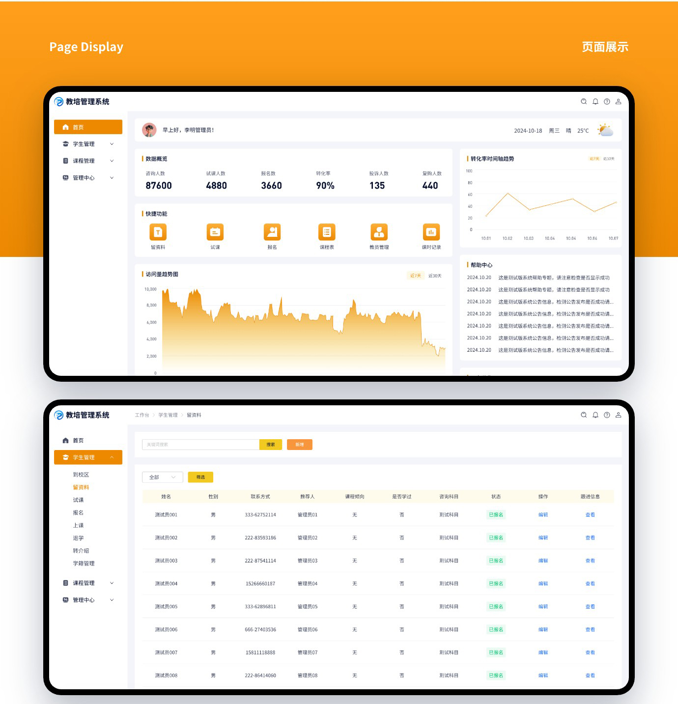 這是我們給廣東以為客戶開發的教培管理系統,功能不算復雜,常規的排課系統、財務管理、人事管理、資料管理、學籍管理、課程管理都是有的。目前第一階段只開發了PC管理端,如果運營能達到預期會進入第二期小程序端或者APP端開發。