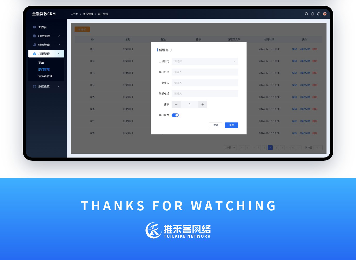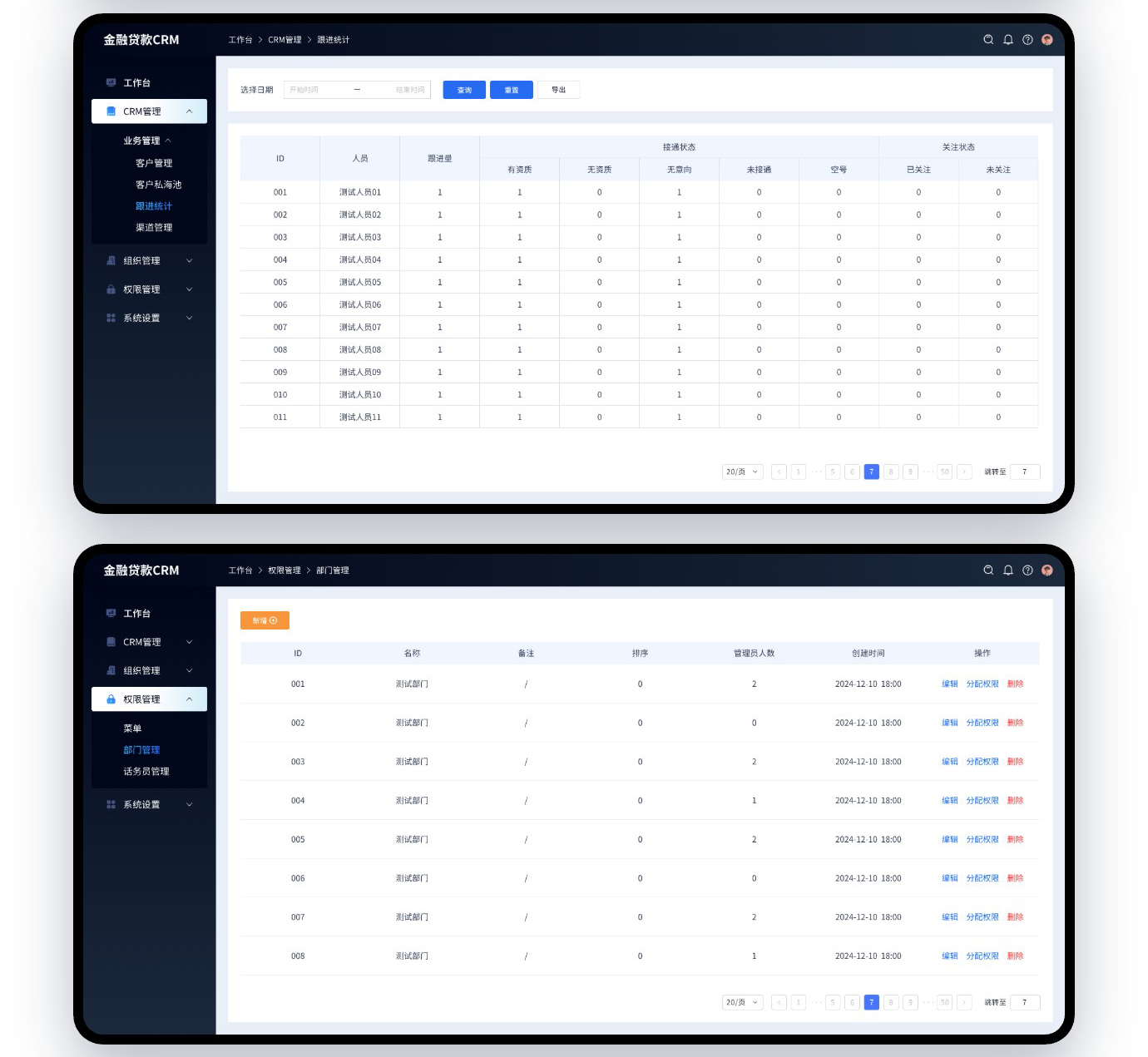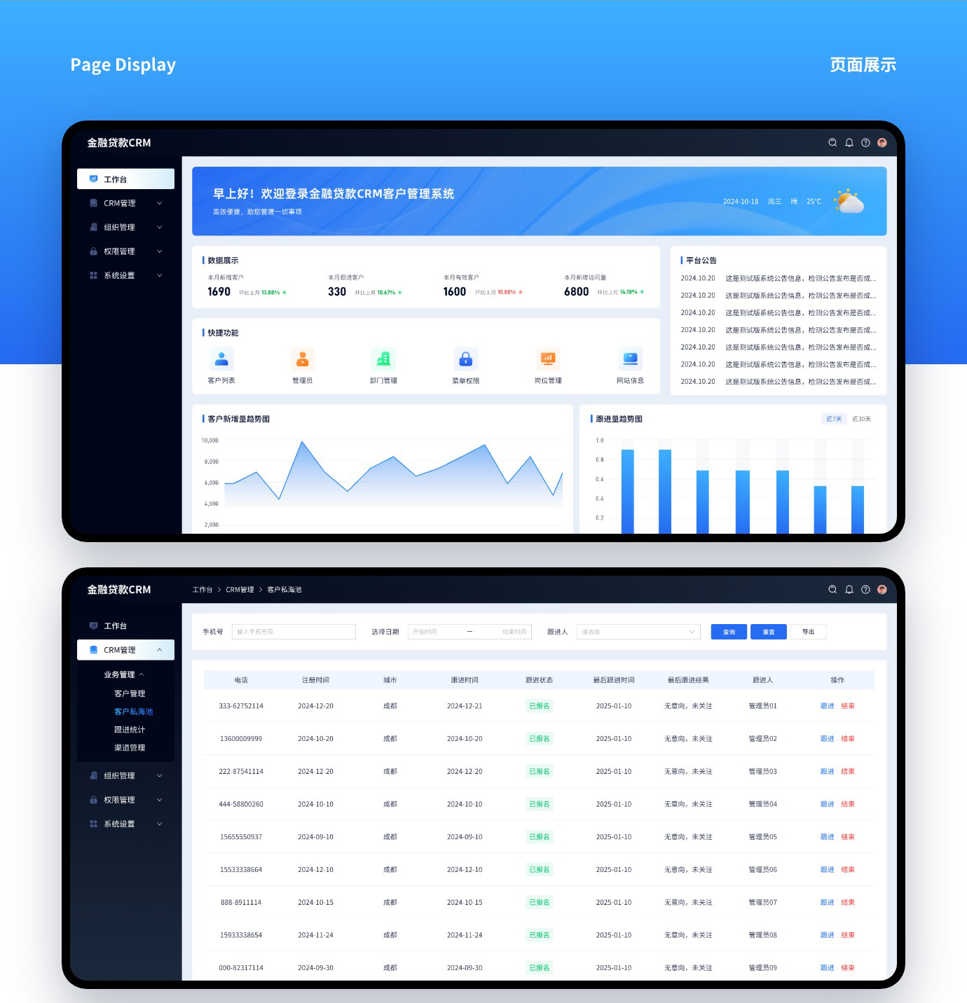 這是給成都一客戶開發的貸款CRM管理系統,數據來源對接了第三方的API,每天能出上萬條數據,出了數據后公司在安排電銷人員進行回訪,回訪后對客戶的意向狀態進行標記,標記后進入到自己的客戶池進行跟進。同時系統也有公海,搶單等功能。