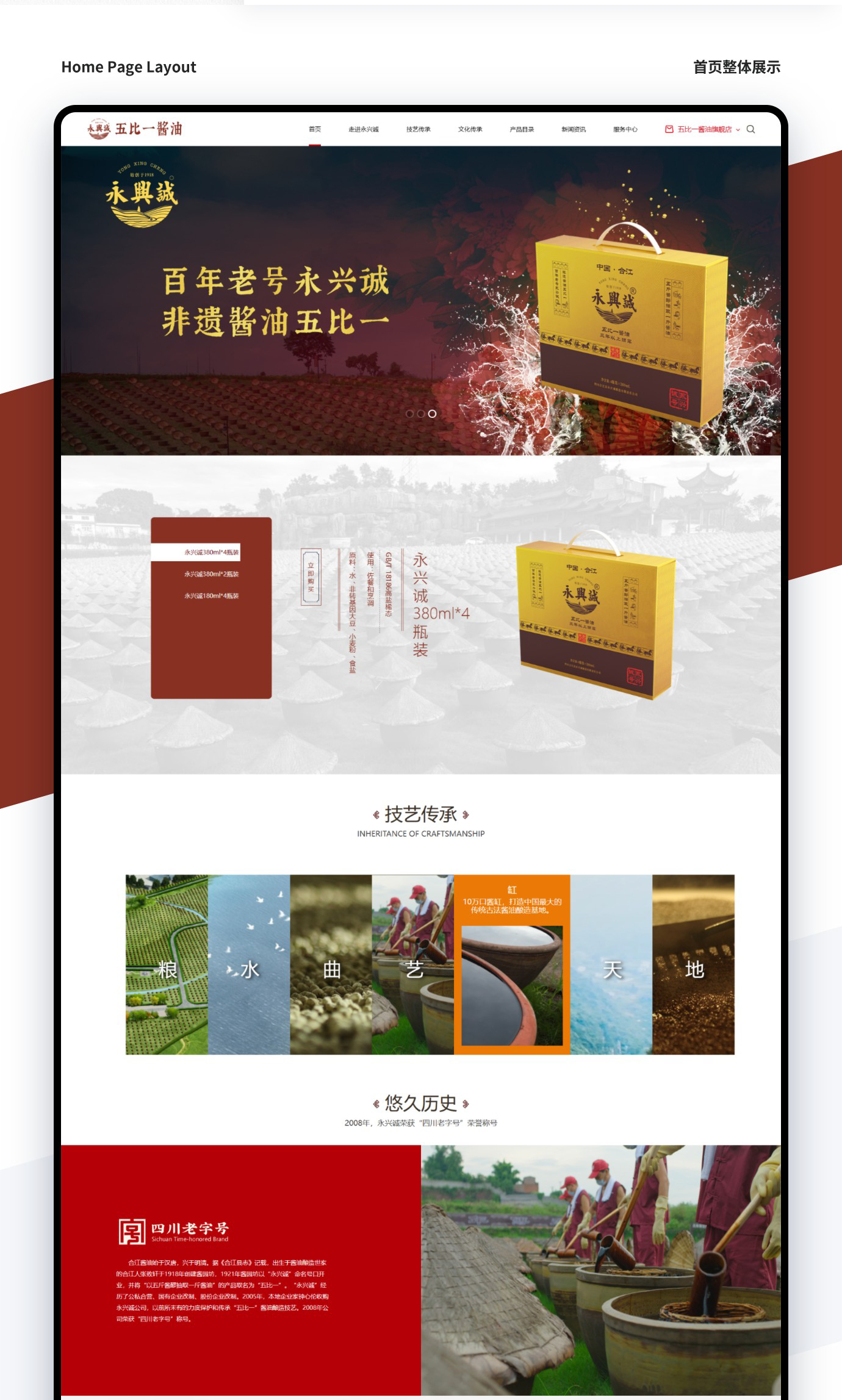 合江縣永興誠釀造有限責(zé)任公司,四川老字號(hào)——四川合江縣永興誠“五比一”醬油,采用傳統(tǒng)手工釀造,其釀造技藝列入“四川省非物質(zhì)文化遺產(chǎn)”保護(hù)名錄。醬油“棕紅錚亮、粘稠適度、醬味綿長、純正柔和、掛碗留香。